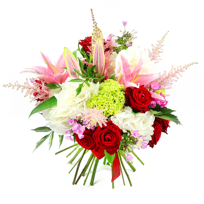 Send a joyous surprise with this breathtaking arrangement made from roses, lilies, hydrangea, pink astible and green celosia. Ideal to say a simple "Thinking of You!" or even "I love you!"
